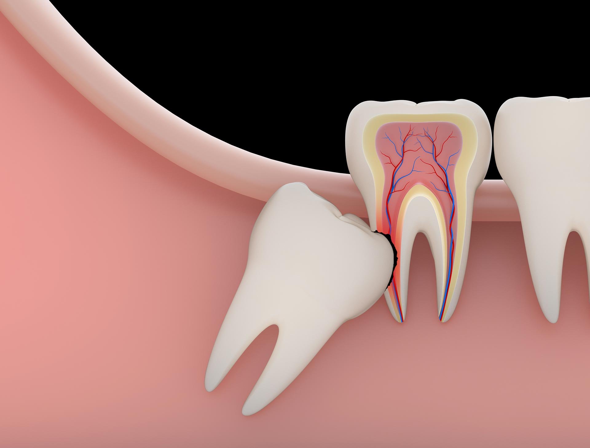 Tooth Decay: If your wisdom tooth is impacted, saliva, bacteria and food can accumulate around it, causing decay to the wisdom tooth or the tooth beside it. This often leads to a painful infection.